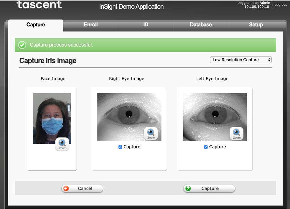 Based on our testing to date, for InSight Face, acquisition performance is largely unaffected by the wearing of regular facemasks, as illustrated by the series of images above. And for Tascent’s InSight One iris and face multimodal device, a face mask is no barrier to getting great iris and face images - as demonstrated by the screenshot below. In the interest of full disclosure, it should be noted that we are still completing data collection to confirm all edge cases, with this made much tougher by the COVID lockdowns, but the initial results are extremely encouraging.